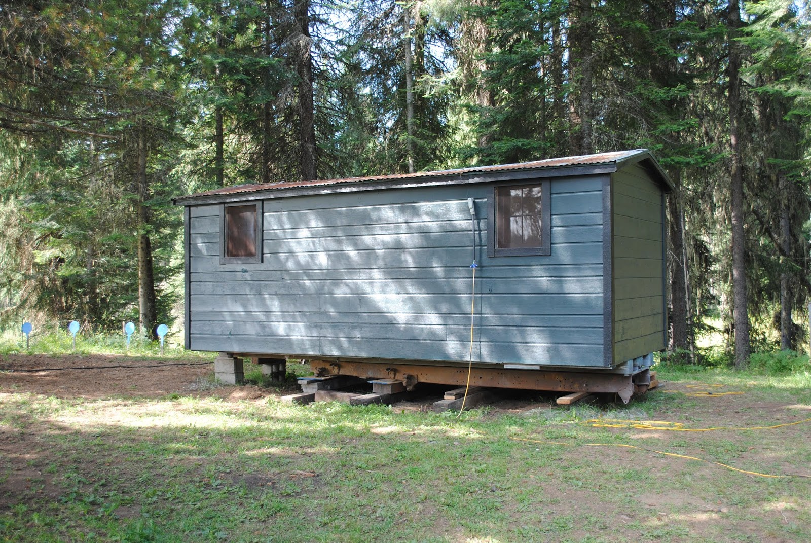 | The cottage when it first came up our mountain, with it's original paint job! |